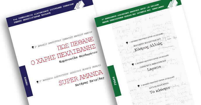 Κυκλοφόρησαν τα βραβευθέντα σενάρια του 12ου Πανελληνίου Διαγωνισμού Συγγραφής Πρωτότυπου Σεναρίου Μεγάλου και Μικρού μήκουςΚυκλοφόρησαν τα βραβευθέντα έργα του 9ου Πανελληνίου Διαγωνισμού Συγγραφής Θεατρικού Έργου